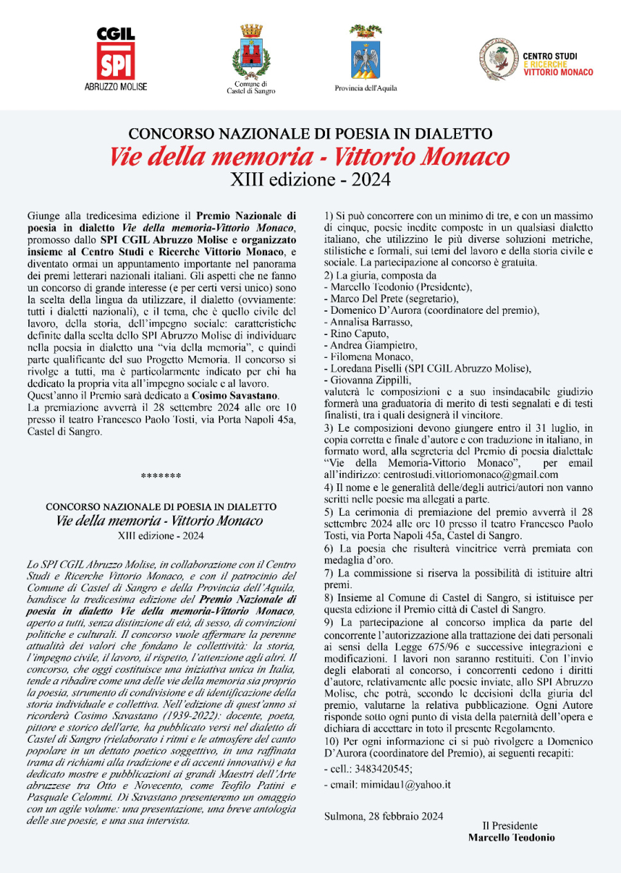 Giunge alla tredicesima edizione il Premio Nazionale di poesia in dialetto Vie della memoria-Vittorio Monaco, promosso dallo SPI CGIL Abruzzo Molise e organizzato insieme al Centro Studi e Ricerche Vittorio Monaco, e diventato ormai un appuntamento importante nel panorama dei premi letterari nazionali italiani. Gli aspetti che ne fanno un concorso di grande interesse (e per certi versi unico) sono la scelta della lingua da utilizzare, il dialetto (ovviamente: tutti i dialetti nazionali), e il tema, che è quello civile del lavoro, della storia, dell’impegno sociale: caratteristiche definite dalla scelta dello SPI Abruzzo Molise di individuare nella poesia in dialetto una “via della memoria”, e quindi parte qualificante del suo Progetto Memoria. Il concorso si rivolge a tutti, ma è particolarmente indicato per chi ha dedicato la propria vita all’impegno sociale e al lavoro.